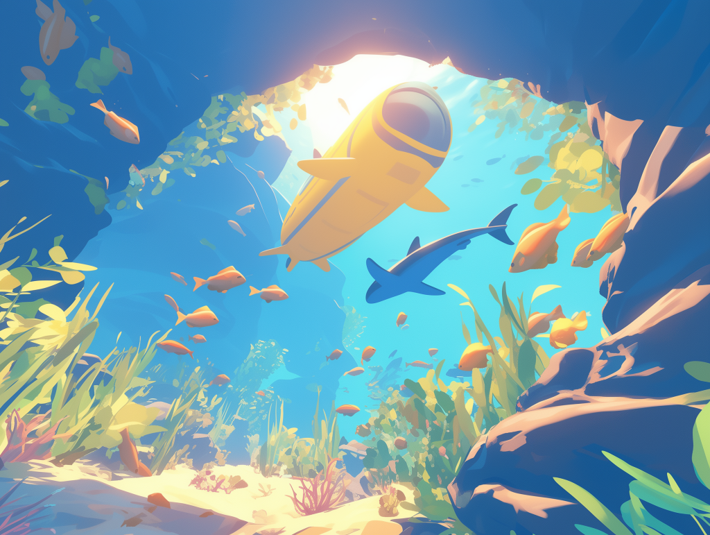 The yellow submarine approached the massive rock. There seems to be something behind the rock. Could it be treasure?