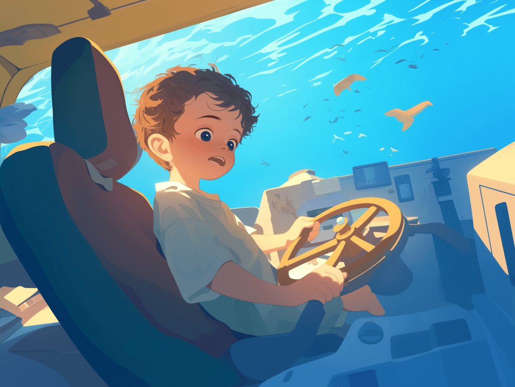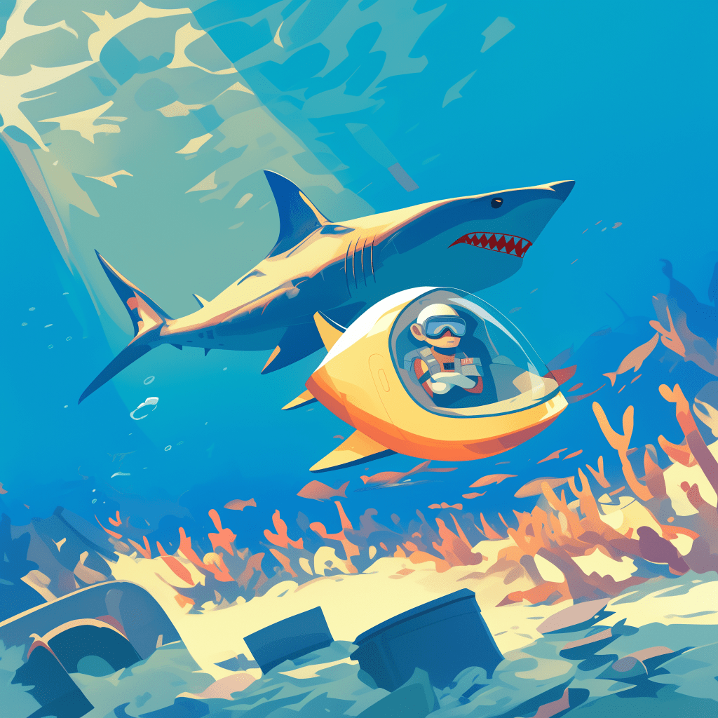 Liam was scared. The submarine was moving quickly, but the shark is catching up. Help! Help!